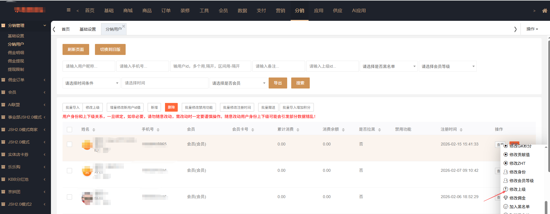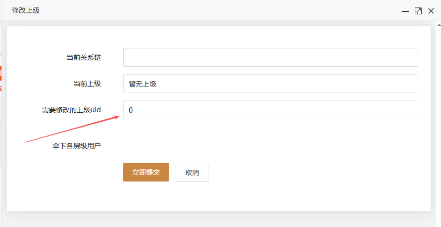 分销>>分销列表,点击操作选择修改上级,可以查看当前关系链及伞下用户,选择需要修改的上级ID,注意:伞下用户不能改为自己的上级,否则会形成关系链死循环