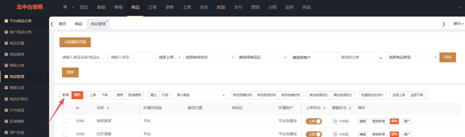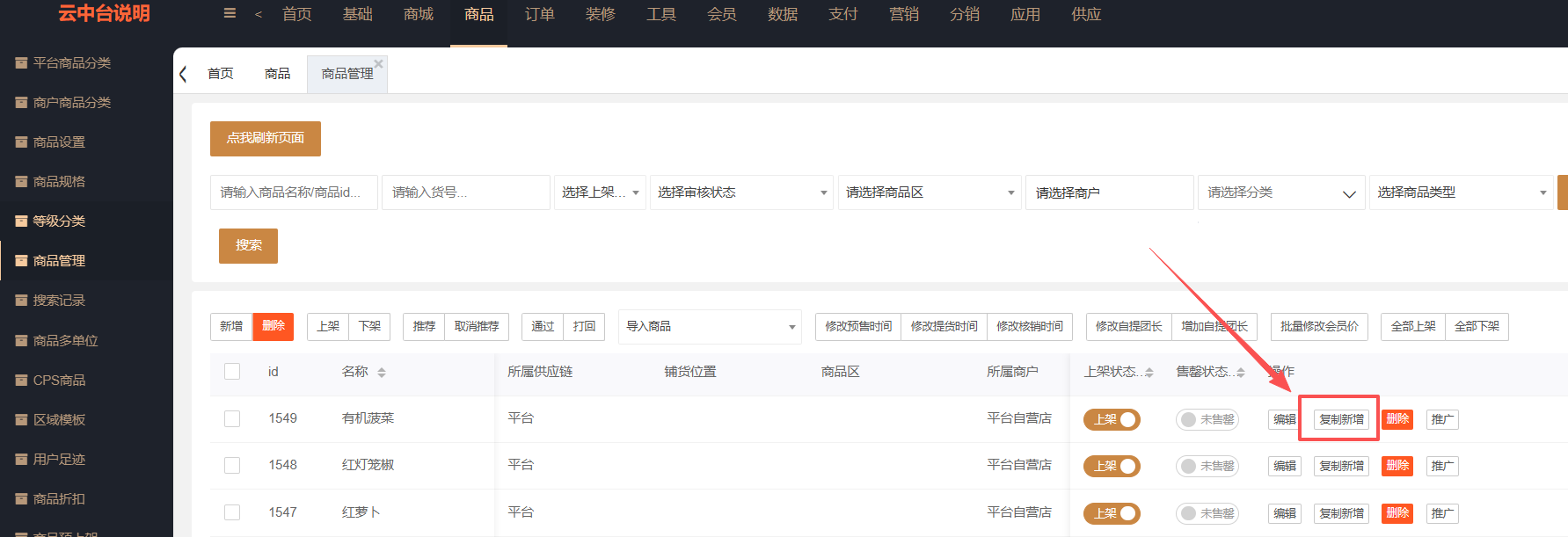 ##新增商品方式一: 商品>商品管理左上角>新增,添加新商品,点击后进入商品信息填写页面按提示填写,星号为必填项,其他根据需求填写 ##新增商品方式二: 商品管理列表找到一个商品>选择复制新增,此商品所有信息会被复制出一个新商品**(注意多规格开启的商品不能操作复制新增)**,点击后进入商品信息填写页面,跟进需求修改需要的参数即可,价格栏需要先提交保存后再重新点击编辑进去后修改,首次不能修改价格