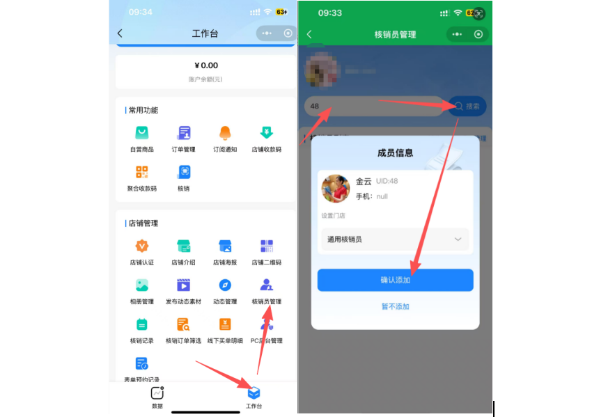 管理员进入工作台,点击核销员管理,输入用户ID点击搜索,找到用户点击添加即可,在核销员管理列表也可以查看核销员的核销记录和删除核销员