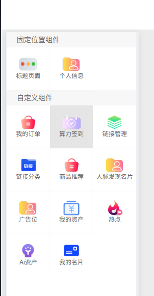 功能区包含固定组件(标题页面、个人信息(有三个样式可以选择,文字、按钮、背景颜色可自定义)、自定义组件(链接管理(可添加图标链接到想要的位置)、广告位(可添加图片链接到想要的位置)