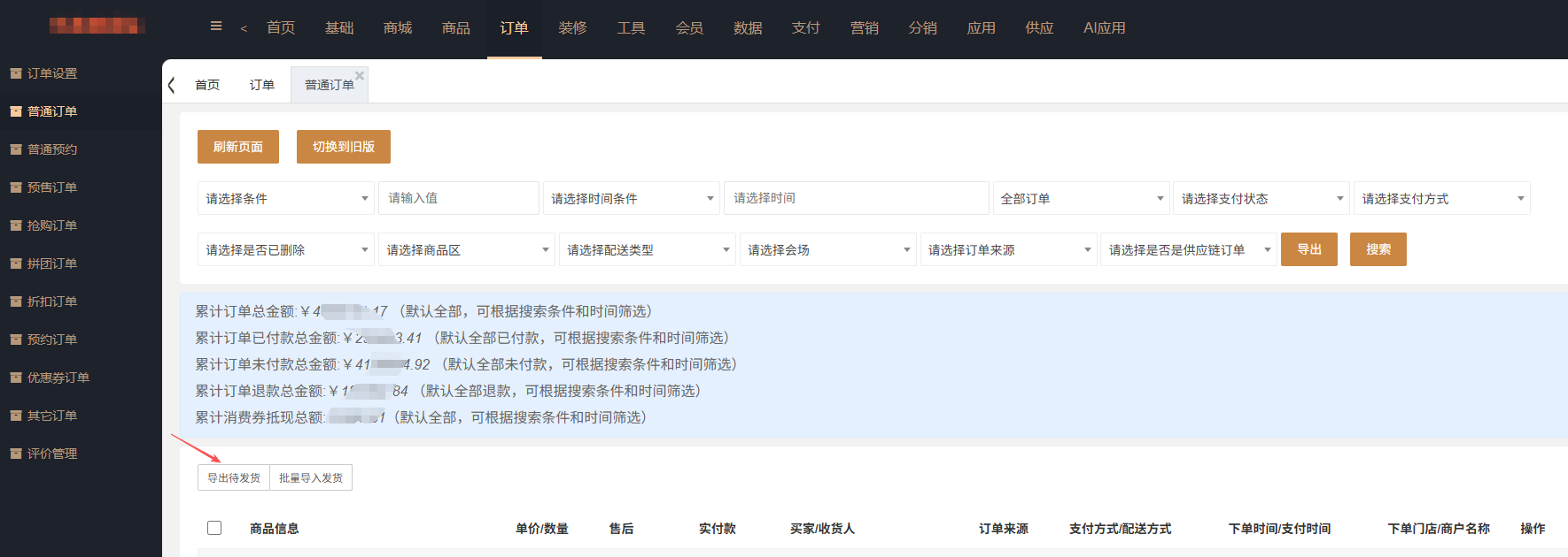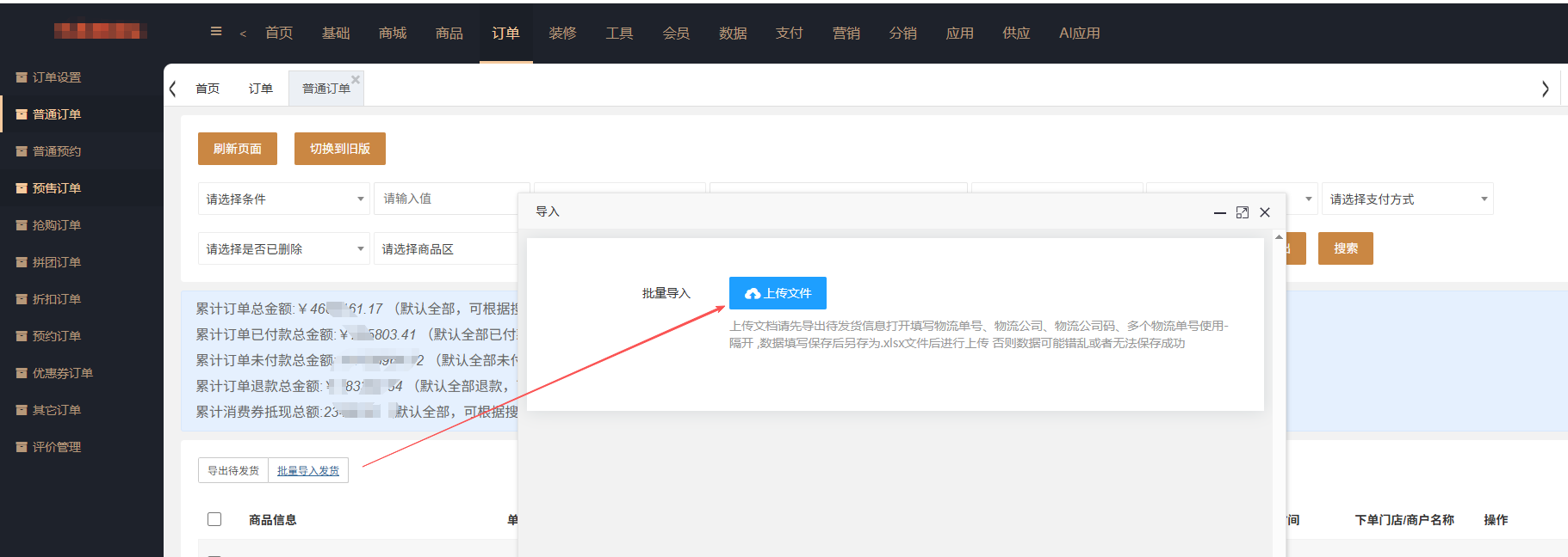 在普通订单页面导出待发货订单,在待发货表格里面填写:物流单号---物流公司(例:顺丰速运)---物流公司码(例:SF),填写商品信息保存文档(文档格式内容不能进行更改) 到后台普通订单页面点击批量导入发货。注意:上传文档请先导出待发货信息打开填写物流单号、物流公司、物流公司码、多个物流单号使用-隔开 ,数据填写保存后另存为.xlsx文件后进行上传 否则数据可能错乱或者无法保存成功