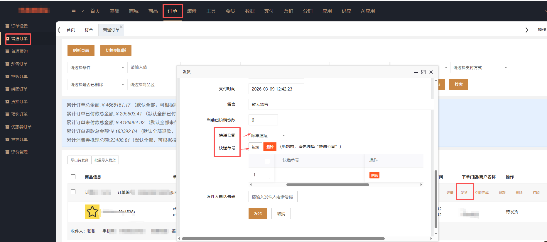 在普通订单页面点击发货进入详情页面,选择快递公司,快递单号点击新增,填写好快递单号和发件人电话